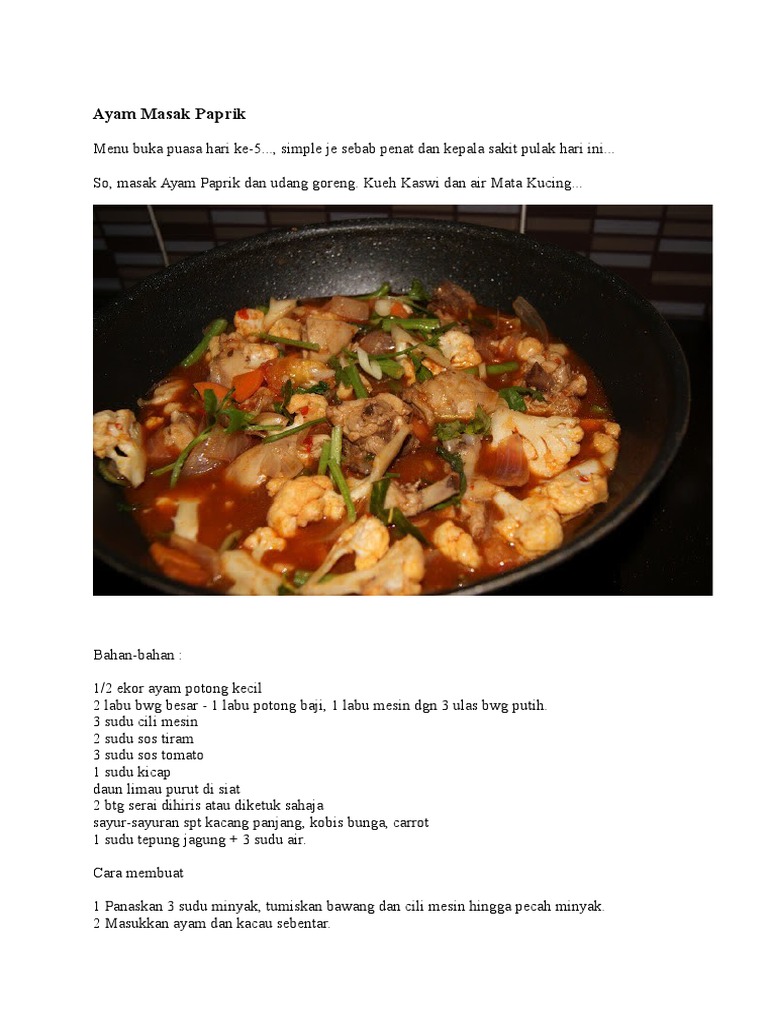Respi Ayam Masak Paprik Perniagaan Katering Restoren from balannambiar.files.wordpress.com Ini adalah resepi ayam paprik yang lazat dan sedap. Panggang ayam bersama bumbu hingga kering dan terpanggang sempurna. Untuk resep ayam masak paprika ini, kamu bisa menggunakan paprika warna apa saja. For optimal taste and aroma, use lots of lime leaves and lemongrass.serve 10ingredients1 whole chicken, cut into 12 pieces3 ¾ glasses coconut milk from 1. 14.883 resep masakan paprika ala rumahan yang mudah dan enak dari komunitas memasak terbesar dunia! Panaskan minyak dalam kuali kemudian goreng hirisan. Jika anda mahukan sesuatu yang lebih istimewa daripada ayam masak merah, bolehlah anda menghasilkan masakan ayam masak ros ini. 5 batang kacang buncis @ kacang panjang (dihiris.